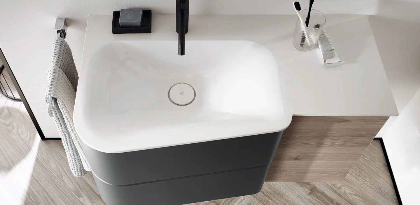 Generell überzeugen die Waschtische mit optimalem Raumverhalten. Selbst die Doppelwaschtische schaffen in ihrer geschwungenen Form mehr Bewegungsfreiheit und eignen sich ideal für Schlauchbäder. Ein weiterer Vorteil der asymmetrischen Form: große seitliche Ablageflächen.