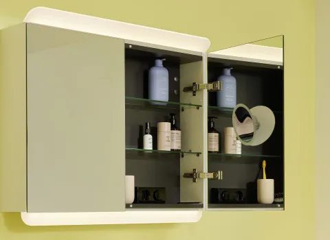 Die komfortabel ausgestatteten Spiegelschränke sind optional mit ein oder zwei LED-Aufsatzleuchten bestückt, was zusätzliche 5 cm Höhe bedeutet. Die wie schräg gestellten Lichtsegel runden den Spiegel nach oben und unten weich ab und sorgen für eine optimale Ausleuchtung des Gesichts.