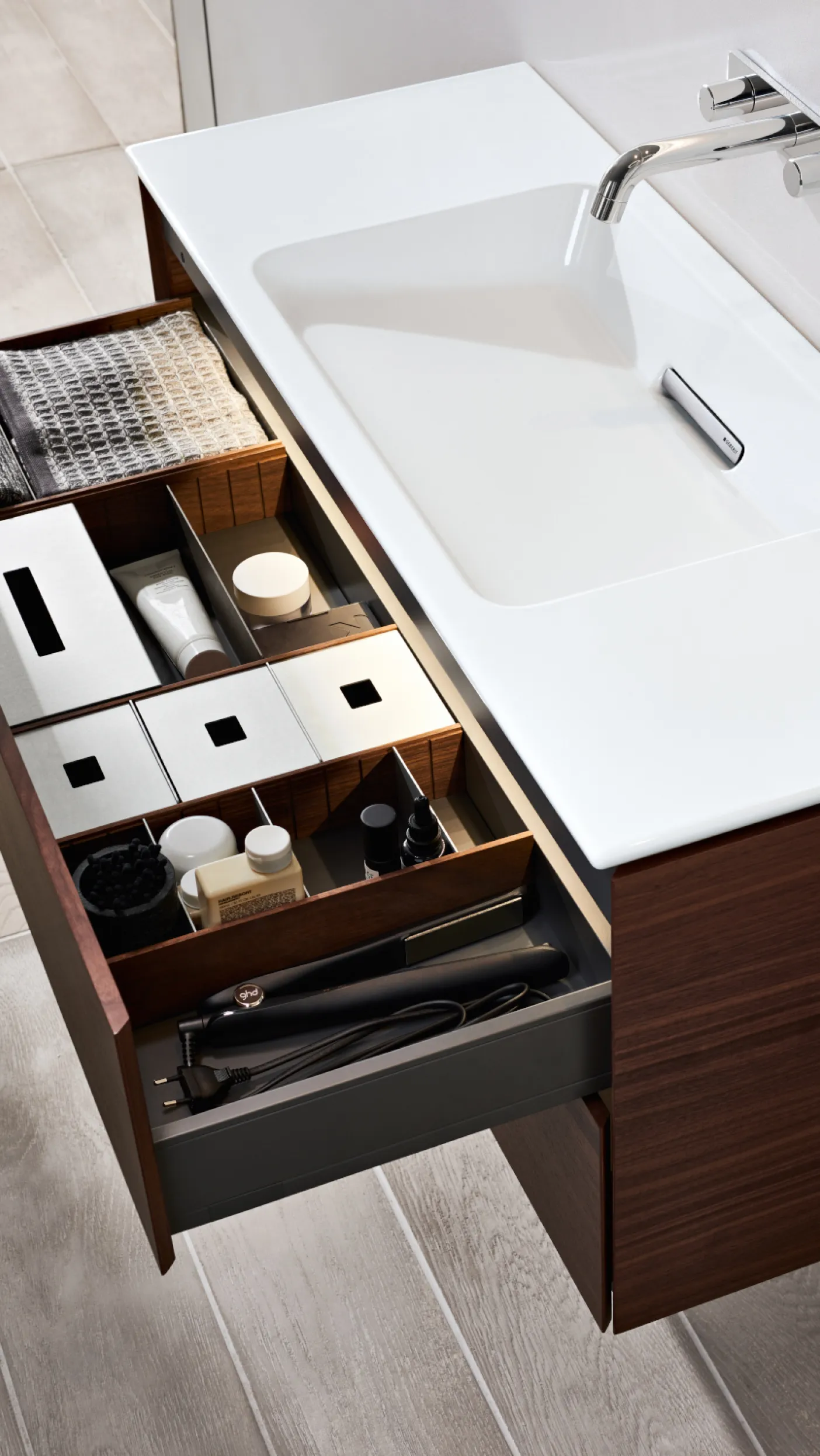 Mit einer Tiefe von 40 cm nehmen sich die Waschtischunterschränke von Geberit ONE zurück, überzeugen aber dennoch mit einem enormen Stauraum - auch im Vergleich zu herkömmlichen Tiefen. Möglich ist dies durch die Lage des Siphons in einer speziellen Vorwandbox. Die Schränke sind in verschiedenen Breiten sowie zwei Oberflächen und Farben erhältlich: Nussbaum amerikanisch Echtholzfurnier und weiß hochglänzend lackiert.